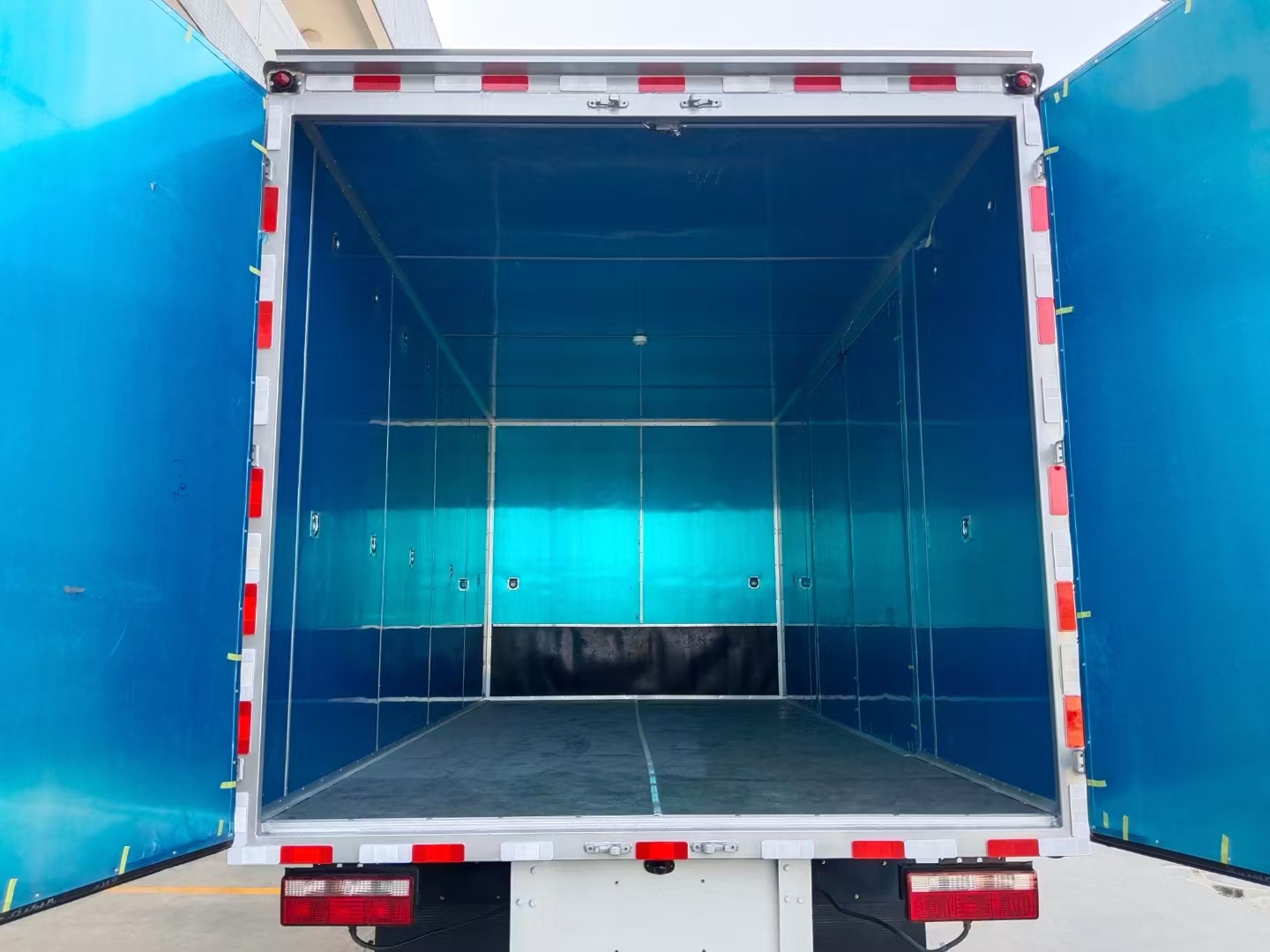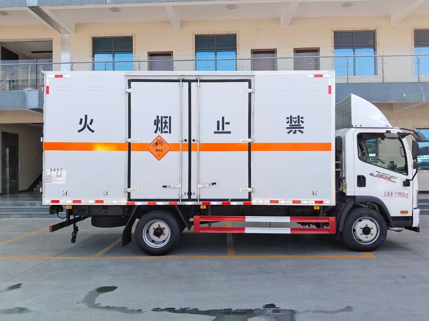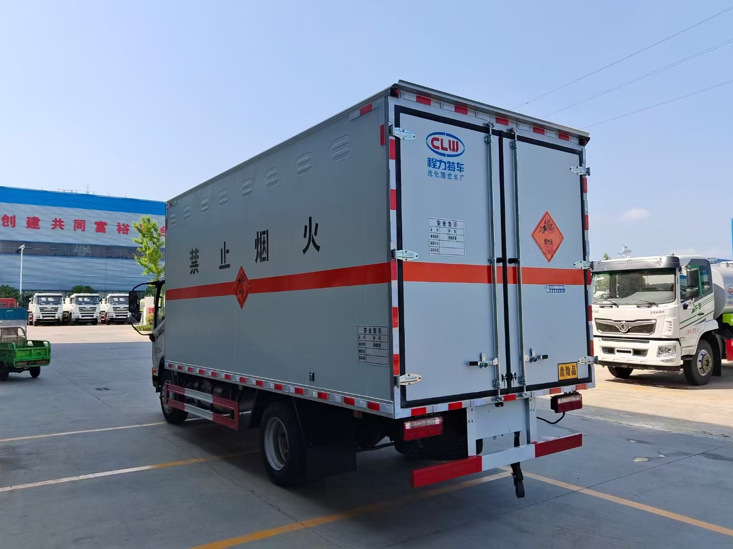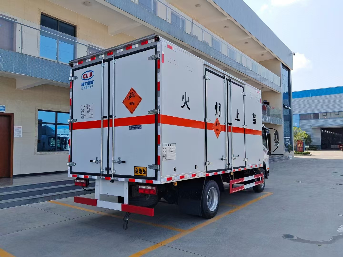 | 貨箱配置 | 廂體為雙層金屬骨架結(jié)構(gòu),外板采用冷軋鋼板,中間填充阻燃泡沫,內(nèi)飾為鋁板。底板為平板上鋪防靜電膠皮。廂內(nèi)兩側(cè)加裝固定貨物臥環(huán),門(mén)框帶防盜報(bào)警器,頂部帶煙霧報(bào)警器,廂體右側(cè)選裝側(cè)門(mén),隨車(chē)配2個(gè)滅火器,危險(xiǎn)標(biāo)志牌,防火帽,危險(xiǎn)品三角頂燈。 (尾部可選裝液壓升降尾板) | ||
