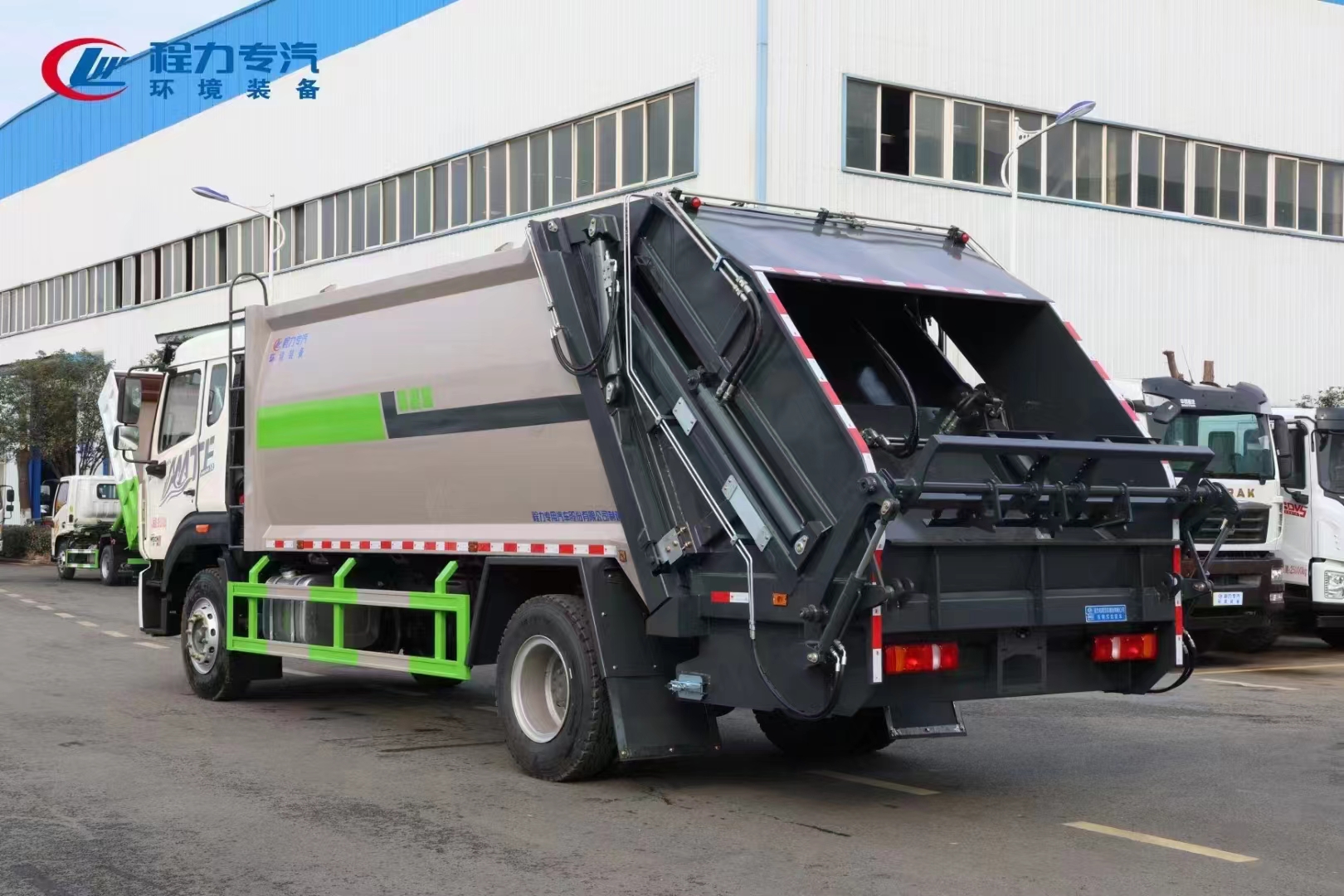 | 上裝配置 | 整車上裝箱體采用高強(qiáng)度鋼制作,容積約16/18立方,新式可破碎刮板,后置污水箱,雙向蠕動壓縮,國內(nèi)知名品牌液壓系統(tǒng),恒力油缸,中梅多路閥,嘉善取力器,合資品牌睿辰鐵殼齒輪泵,駕駛室內(nèi)及車身外集中CAN電控系統(tǒng),尾部可選裝掛桶翻轉(zhuǎn)機(jī)構(gòu),帶氣動后蓋,可實(shí)現(xiàn)垃圾桶的翻轉(zhuǎn)傾倒上料,亦可選裝擺臂裝置、三角斗裝置、大落地全密封斗裝置等進(jìn)料裝置。壓縮比高,液壓系統(tǒng)穩(wěn)定可靠,高品質(zhì)、高性價比! | ||